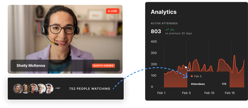 Each booth acts as a hub for sharing branded content, marketing collateral, and downloadable assets. And as each booth can be staffed by a company representative, sponsors can offer product demos and hold private conversations directly with attendees.