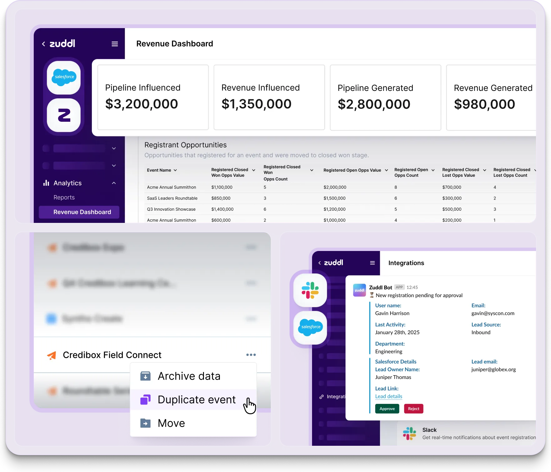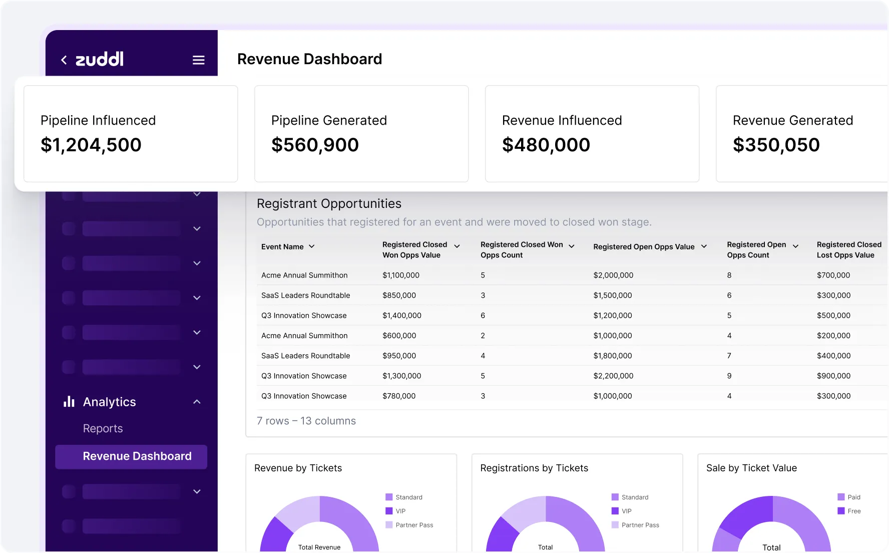 ..with deep bi-directional sync brings CRM and events data together to reveal revenue impact - in Zuddl and in the CRM. Dive as deep, or soar as high as you like - engagement, cost, pipeline, revenue.