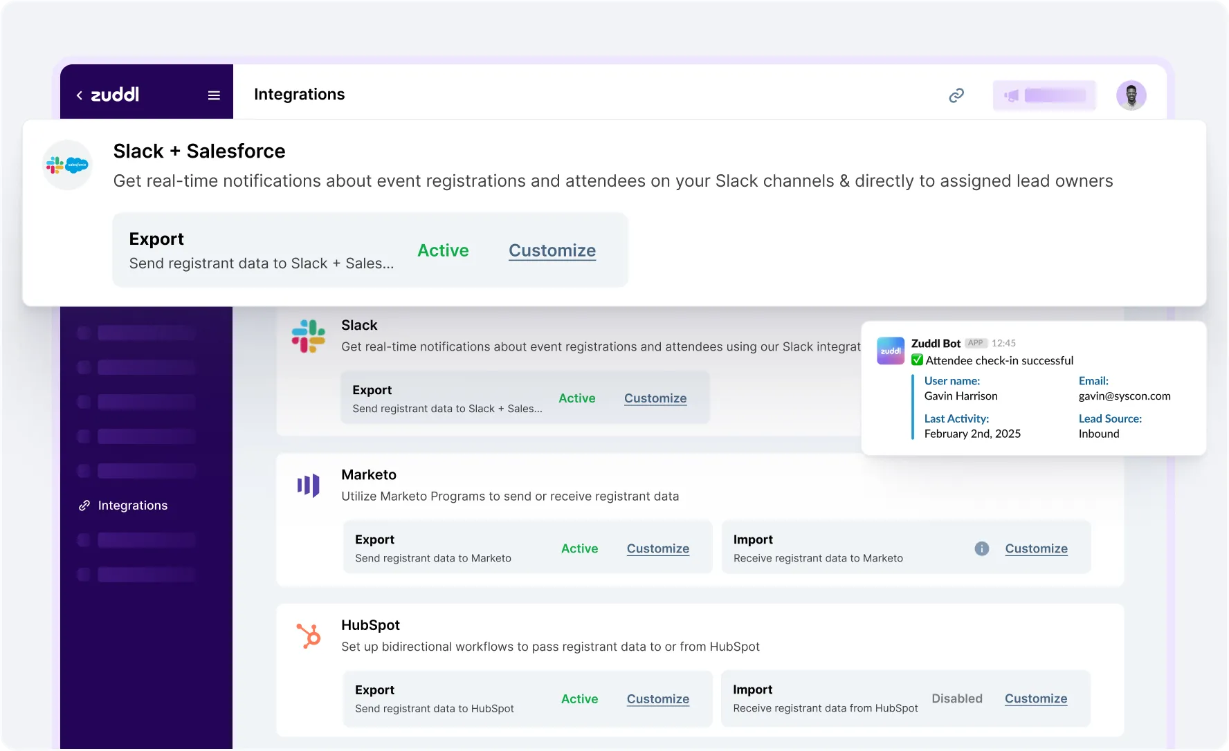Most platforms sync registration data to Salesforce in one direction. Zuddl's bi-directional sync means the event platform also reads from Salesforce, showing which registrants are hot opportunities during check-in. Automated child campaign mapping maintains attribution hierarchy. Custom field mapping preserves existing lead scoring models.