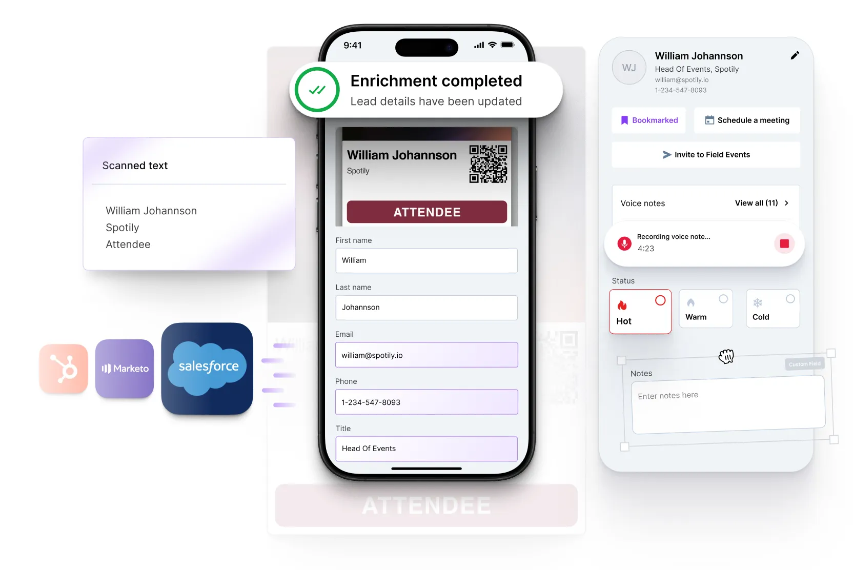 Scan badges or business cards with your phone, and our AI-powered system instantly extracts and enriches lead details. Need to swap something? Manual edits are quick and ensure complete accuracy.